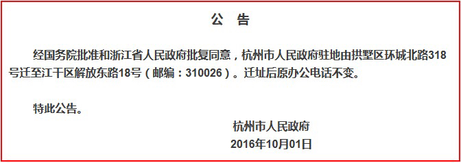 经国务院批准和浙江省人民政府批复同意,杭州市人民政府驻地由拱墅区环城北路318号迁至江干区解放东路18号(邮编:310026)。迁址后原办公电话不变。